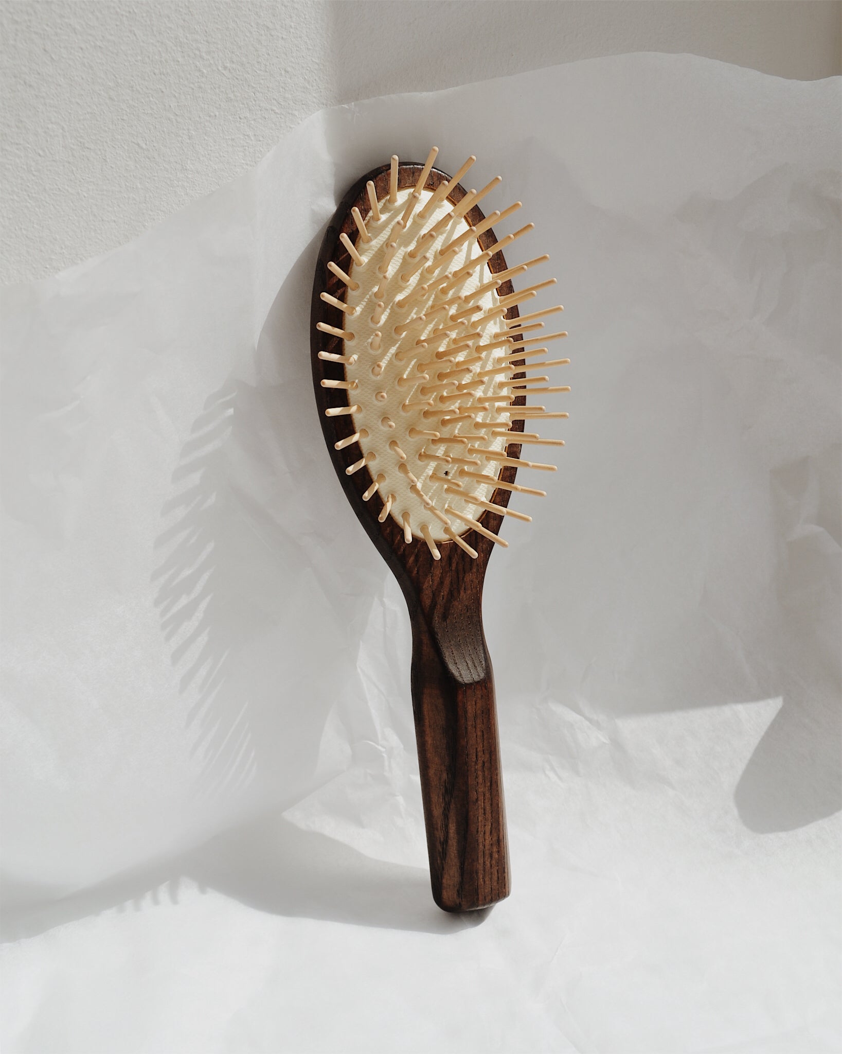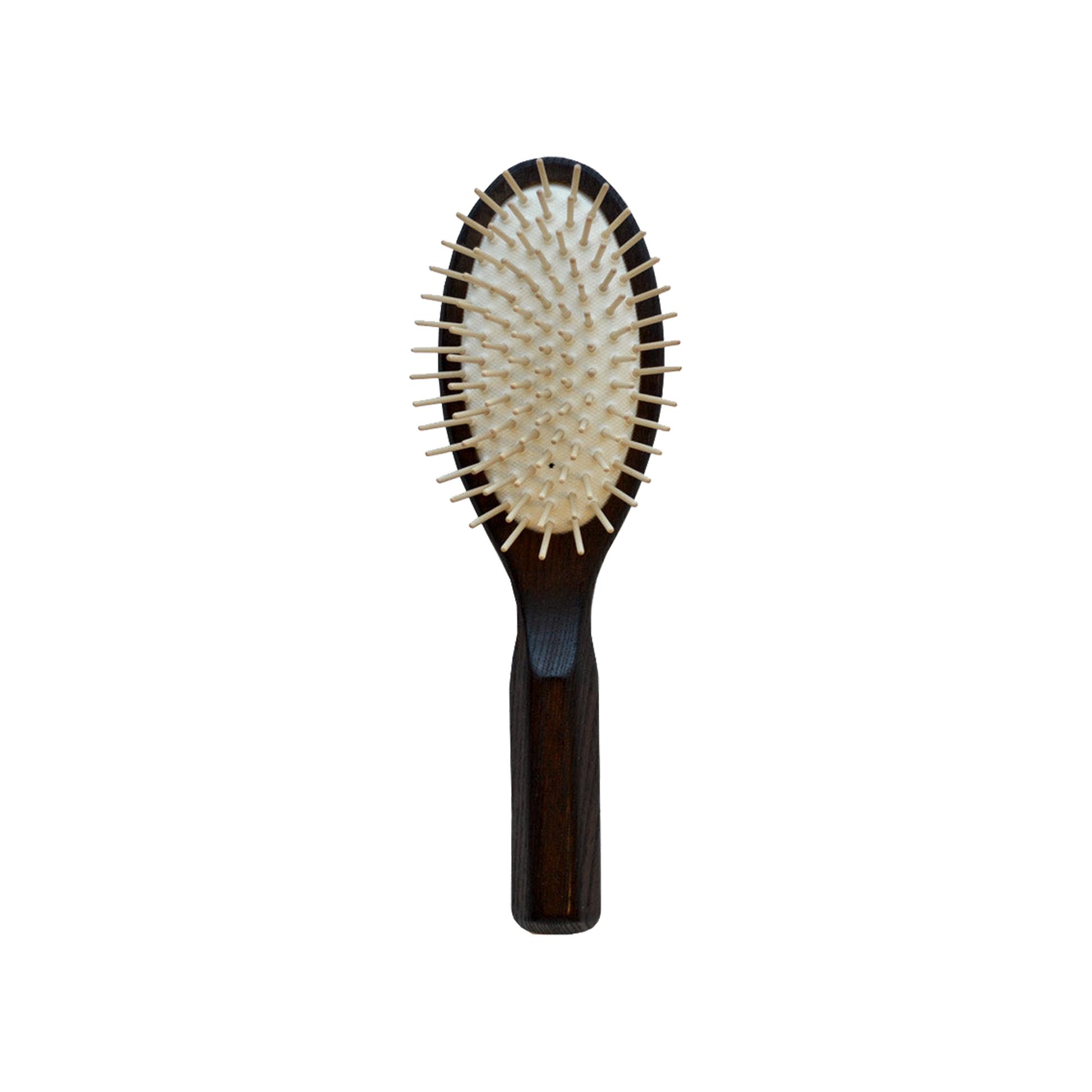 The Glasshouse Cushion Brush is made from high quality thermo ash wood, with real wood pins. Its rounded shape is ideal for all hair types and it makes a great detangler. Thermo ash wood is a type of thermally modified timber that is treated at high temperatures up to 250 degrees. By treating the wood this way, it reduces its water absorption, gives it longer durability and also resistance against fungi and insects. The process gives the wood its rich, dark colour and contains no chemical substances. Comfortable to use due to its ‘cushion like’ qualities, this beautiful brush is unique and long-lasting.