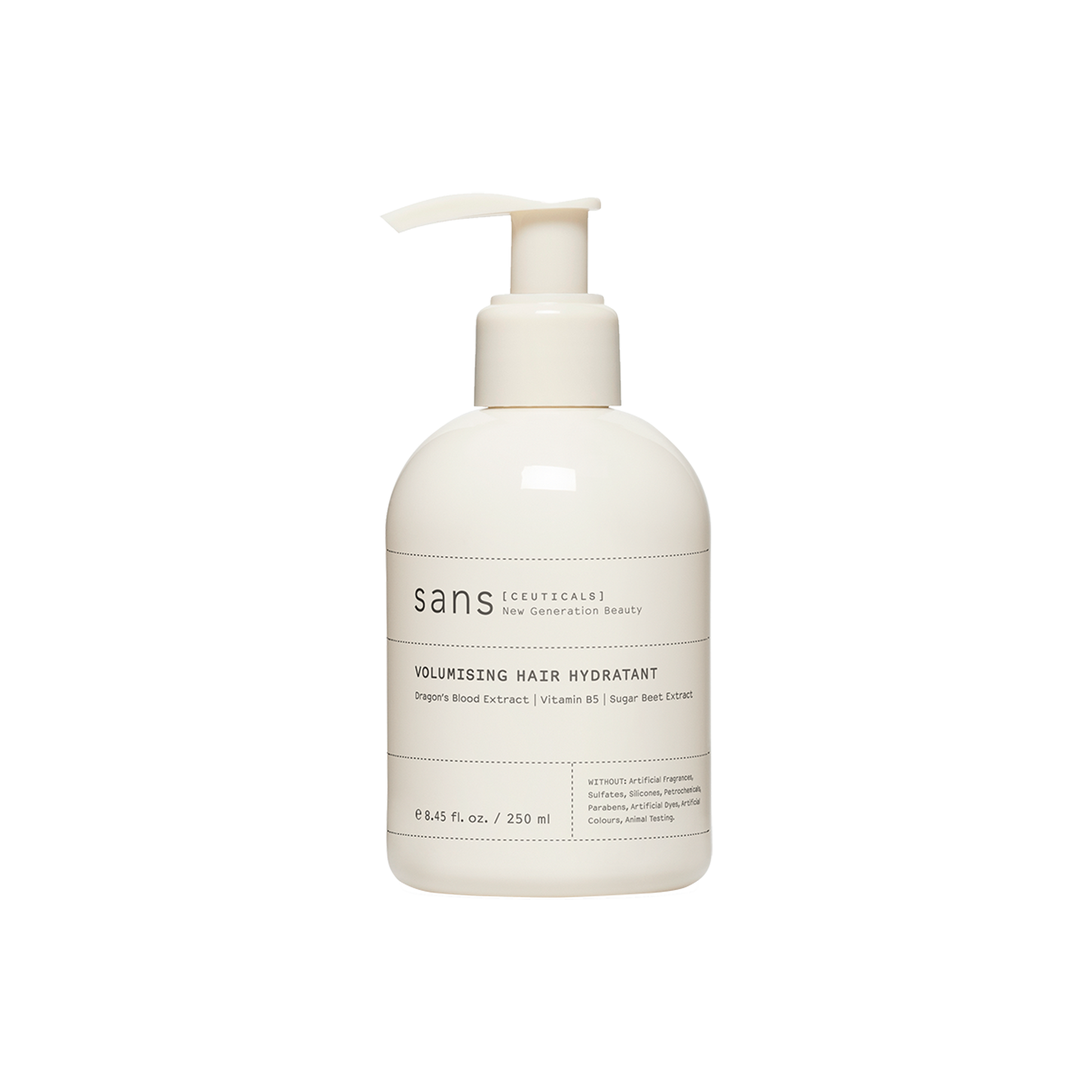 A light formulation including Phyto Keratin and Baobab Extract to plump, boost and fortify intracellularly, giving your hair a feeling of substance and fullness. Sans [ceuticals] Volumising Hair Hydratant also contains a potent combination of small molecular phyto-amino acids to strengthen and protect your hair.